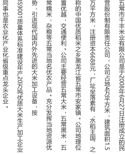 五常市千豐米業(yè)有限公司是于2008年6月27日注冊成立的民營股份制有限責(zé)任公司
